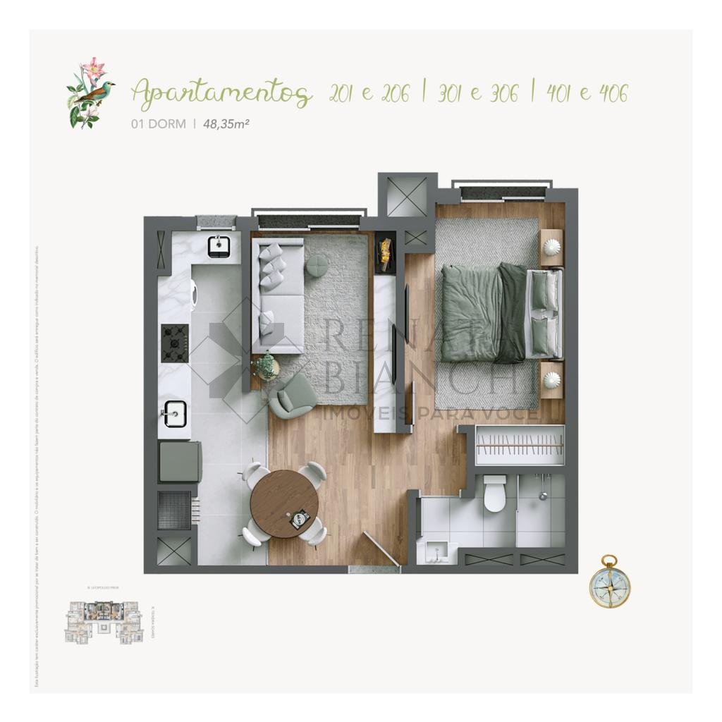 Apartamentos de 1 dormitório com living para estar e jantar, cozinha com churrasqueira, área de serviço e 1 banheiro social. 1 vaga de garagem.