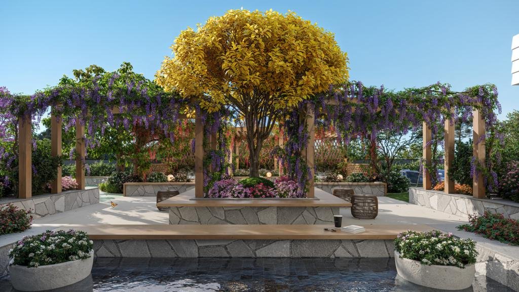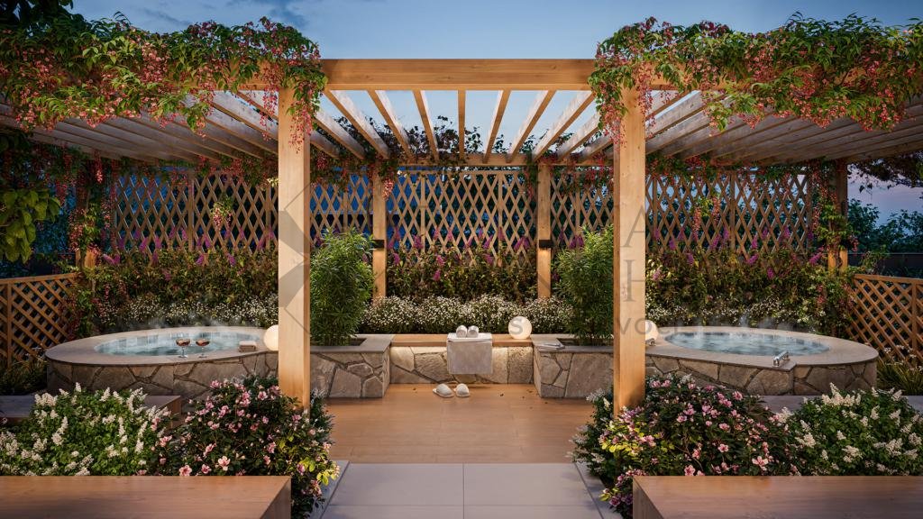 Um jardim projetado pelo Takeda Design colore e inspira a vida com espaços acolhedores: espelho dágua, ofurôs ao ar livre, lounge do fogo, redário, espaço das águas, etc.